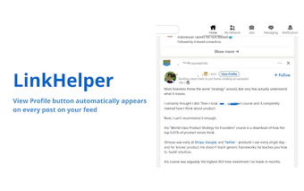 LinkHelper är ett kostnadsfritt tillägg för Chrome som revolutionerar sättet användare interagerar med LinkedIn. Genom att lägga till en 'View Profile'-knapp vid varje inlägg, möjliggör det snabba förhandsgranskningar av profiler utan att behöva navigera bort från flödet. Tillägget är utformat för att hålla användarens kontext intakt, vilket gör det enkelt att bläddra igenom profiler samtidigt som man följer sitt flöde.